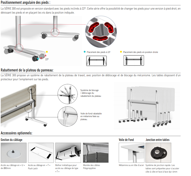 TALENT a été conçue pour des espaces multifonctionnels. Cette table possède 4 roulettes dont deux sont verrouillables. Sa hauteur est fixe et sa surface est rabattable.